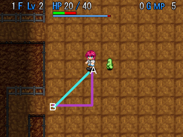 図のような地形のとき、AからBへ下→左と移動すると4ターンかかりますが、左下へ移動すると半分の2ターンで到達することができます。